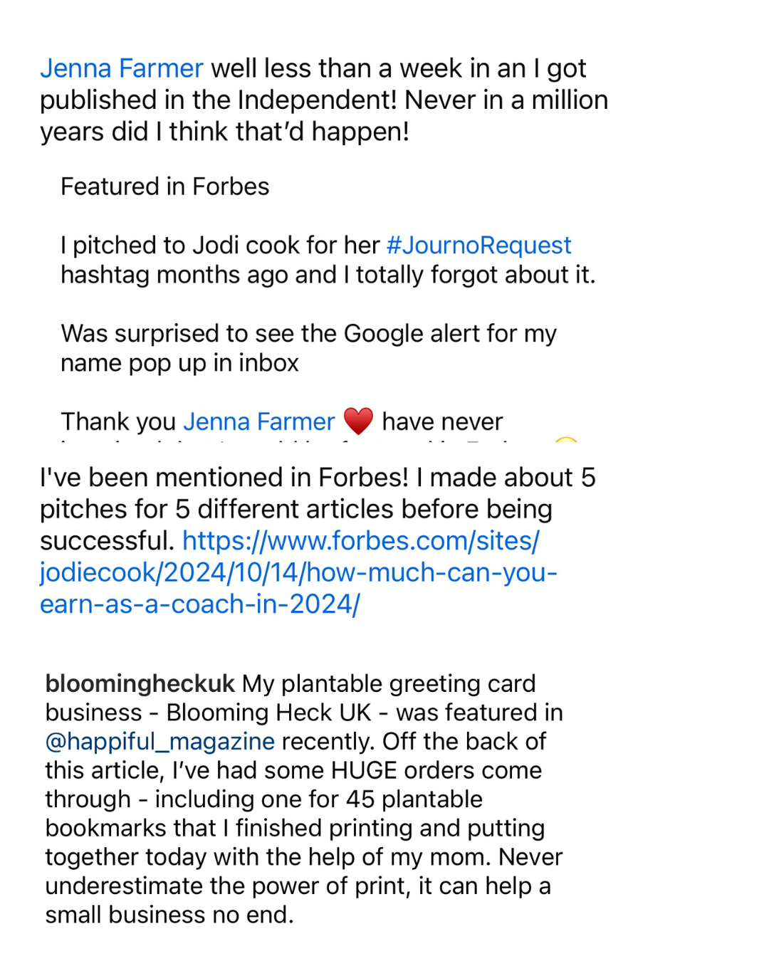 In the private members Facebook group and whatsapp broadcast channel, you'll receive daily press opportunities to pitch throughout the week. Thanks to these opportunities, members have been featured in Forbes, The Times, Netmums, OK! The Telegraph, Happiful, Huff Post, I Paper to name but a few.